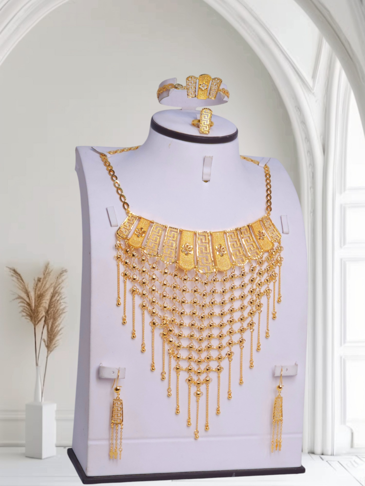 - طقم تم تصنيعها باستخدام مواد عالية الجودة مع طلاء من ماء الذهب لإضفاء لمعان وبريق خلاب و ستضمن لك هذه الجودة الممتازة أن تستمتعي بالسلسلة لفترة طويلة دون تآكل أو فقدان للونها الجميل.