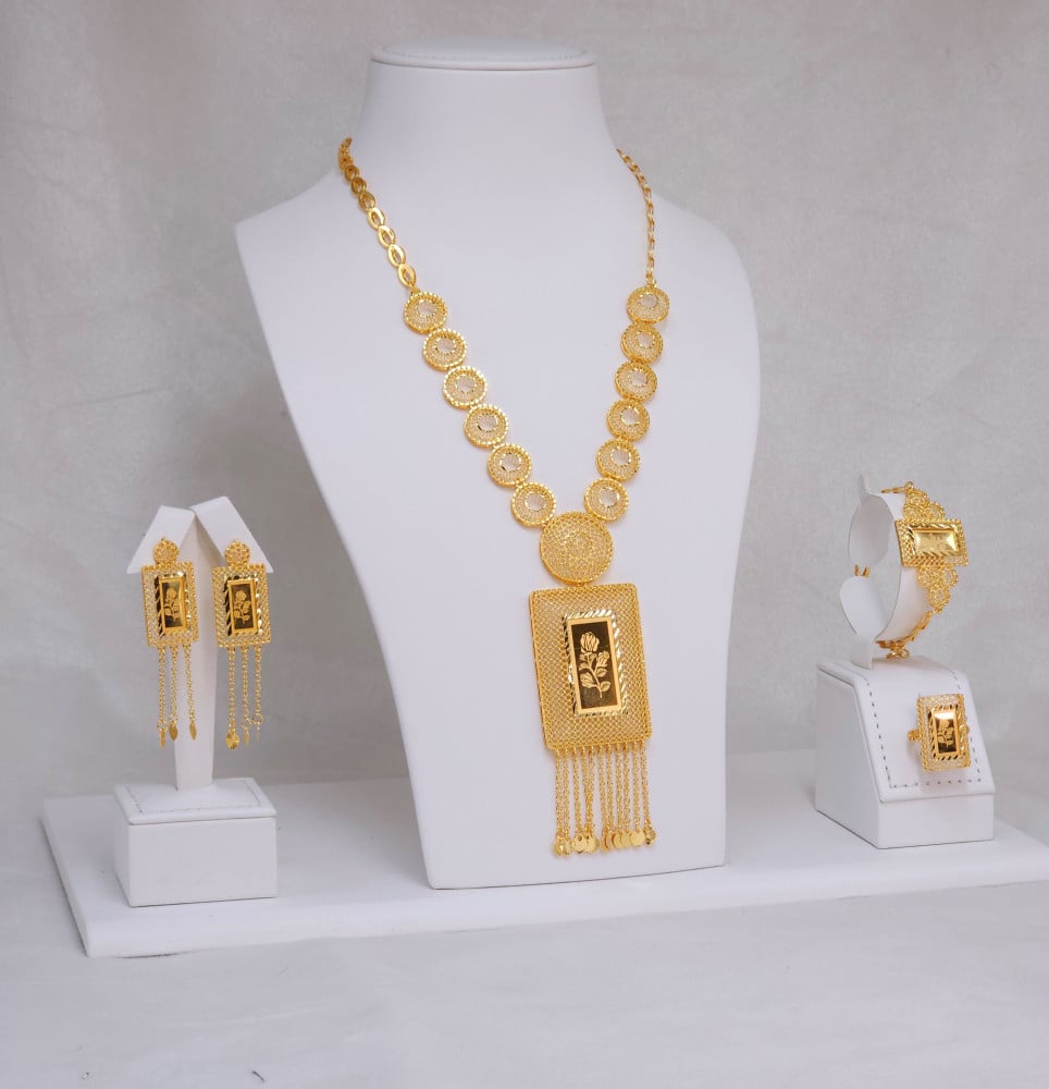 طقم ملكي نسائي يتميز بجودة حيث انه مطلي بماء الذهب ليكتسب اللمعان والبيريق، تم تصميمه من فريق مختص بتمصميم الذهب ليضيف لك الاناقة ولجمالك 🤍