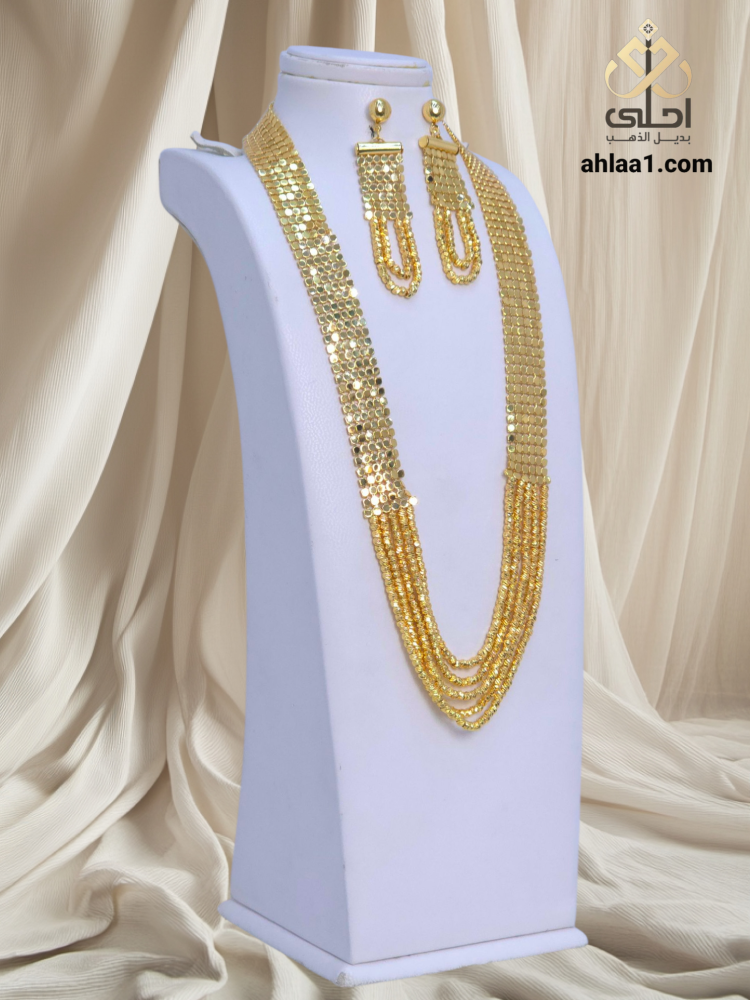 عقد نسائي يتميز بجودة حيث انه مطلي بماء الذهب ليكتسب اللمعان والبيريق، تم تصميمه من فريق مختص بتمصميم الذهب ليضيف لك الاناقه بتصميمه الراقي والذي يتدلى على عنقك بكل تناغم وجاذبيه ، اللامعه بأشكال أنيقه مترابطه معا ، بتصميم جذاب يمتزج بأناقه مع طلتك ، نسقي الطقم مع اطلالتك في مناسباتك المهمه لطله جذابه وخاطفه للانظار