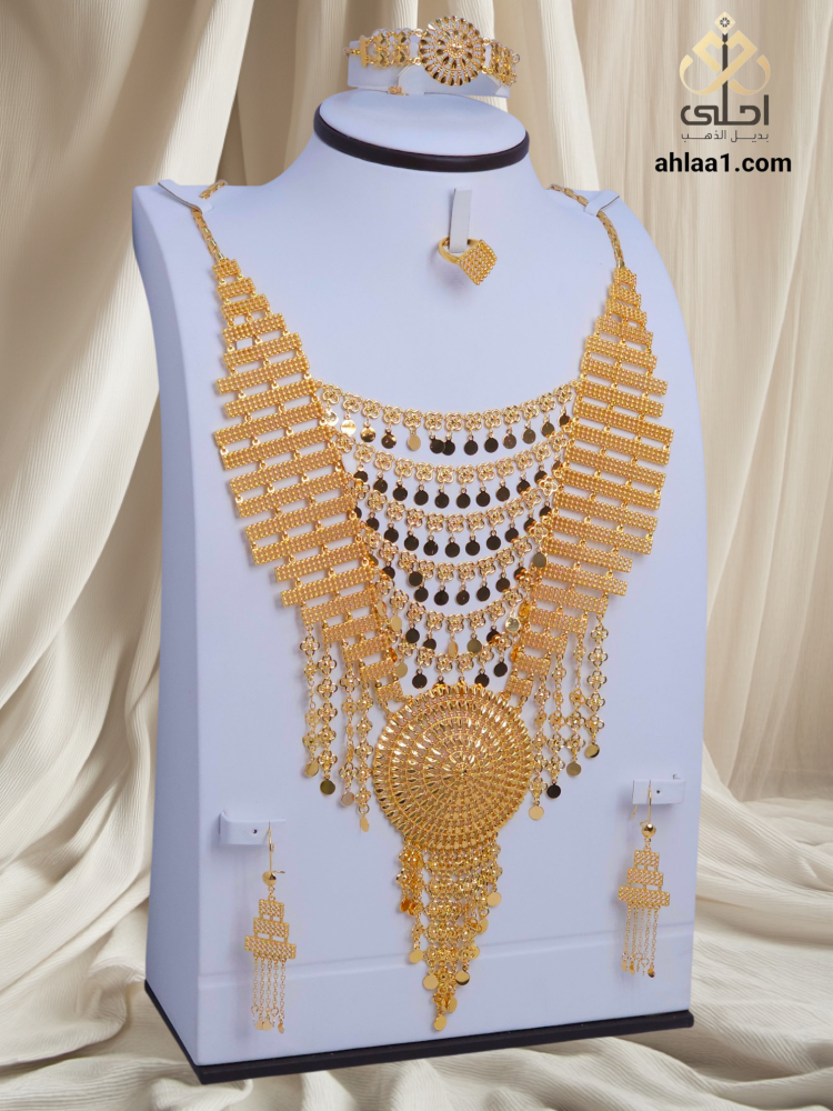 - طقم مطلي ذهب يتمتع مما يمنحه لمعانًا وبريقًا استثنائيًا و ستتألقين بأناقة مترفة و تلفتين الأنظار بلمسة الذهب الراقية.