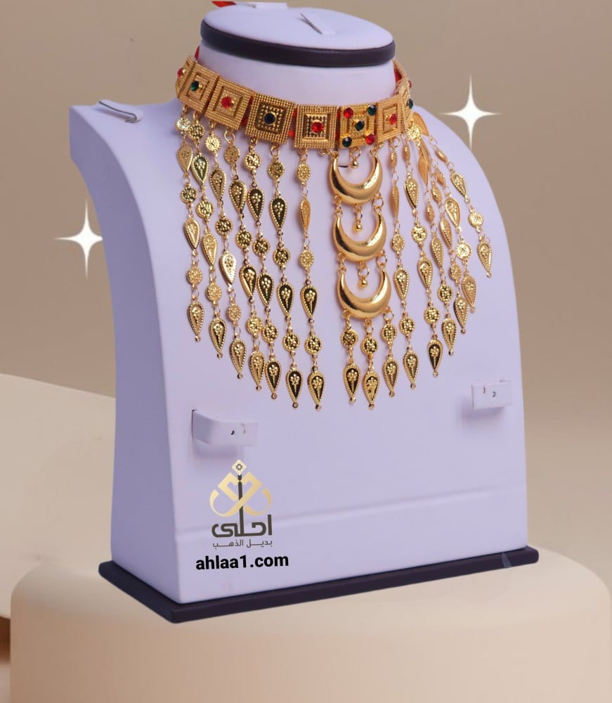 مخنق نسائي يتميز بجودة حيث انه مطلي بماء الذهب ليكتسب اللمعان والبيريق، تم تصميمه من فريق مختص بتمصميم الذهب ليضيف لك الاناقه بتصميمه الراقي والذي يتدلى على عنقك بكل تناغم وجاذبيه ، اللامعه بأشكال أنيقه مترابطه معا ، بتصميم جذاب يمتزج بأناقه مع طلتك ، نسقي الطقم مع اطلالتك في مناسباتك المهمه لطله جذابه وخاطفه للانظار